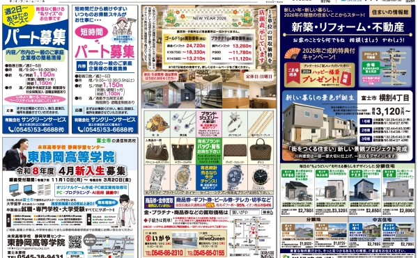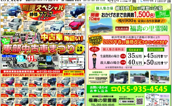 最近の投稿 NEW 2026-01-10ライフニュースライフニュース電子チラシ投稿者 1月10日(土)富士富士宮総合版 NEW 2026-01-09ライフニュースライフニュース電子チラシ投稿者 1月9日(金)沼津三島駿東総合版 ハイブリッド版 2025-12-20ライフニュースライフニュース電子チラシ投稿者 12月20日(土)裾野御殿場版 2025-12-19ライフニュースライフニュース電子チラシ投稿者 12月19日(金)沼津版 2025-12-13ライフニュースライフニュース電子チラシ投稿者 12月13日(土)三島田方総合版 2025-12-13ライフニュースライフニュース電子チラシ投稿者 12月13日(土)裾野御殿場版 SERVICEオリジナル折込広告 [ライフニュース] 発行エリア [ライフニュース] 料金・枠サイズ [ライフニュース] 発行予定表 [ライフニュース] ご掲載の流れ [ライフニュース] データ入稿について(テンプレート) [ライフニュース] 電子版 LIFE NEWS 電波広告 WEB関連業務 お気軽にお問い合わせください。055-924-1230平日/8:30〜17:30 土曜/8:30〜15:30 ※日曜・祝日休業 お問い合わせフォームはこちら お気軽にどうぞ